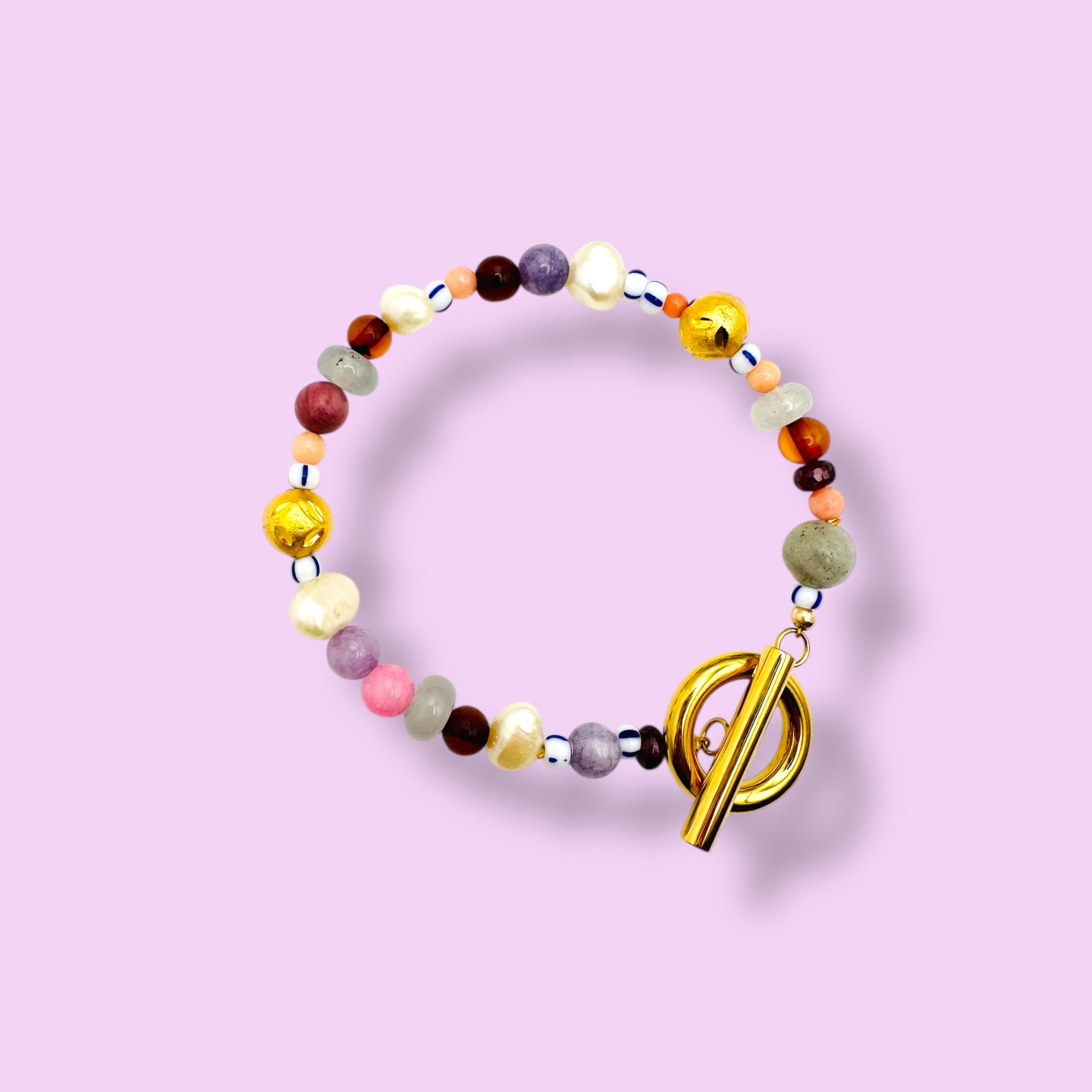Dieses einreihige Armband kombiniert Perlen mit einer bunten Auswahl an Steinen in Rosa, Lila, Braun und Grün. Es ist leicht und angenehm zu tragen und der ideale Begleiter für jeden Tag. Der elegante, goldfarbene Knebelverschluss rundet den Look ab. AVA CLASSIC ist perfekt zum Layering oder ein tolles, leichtes Accessoire für sich allein.