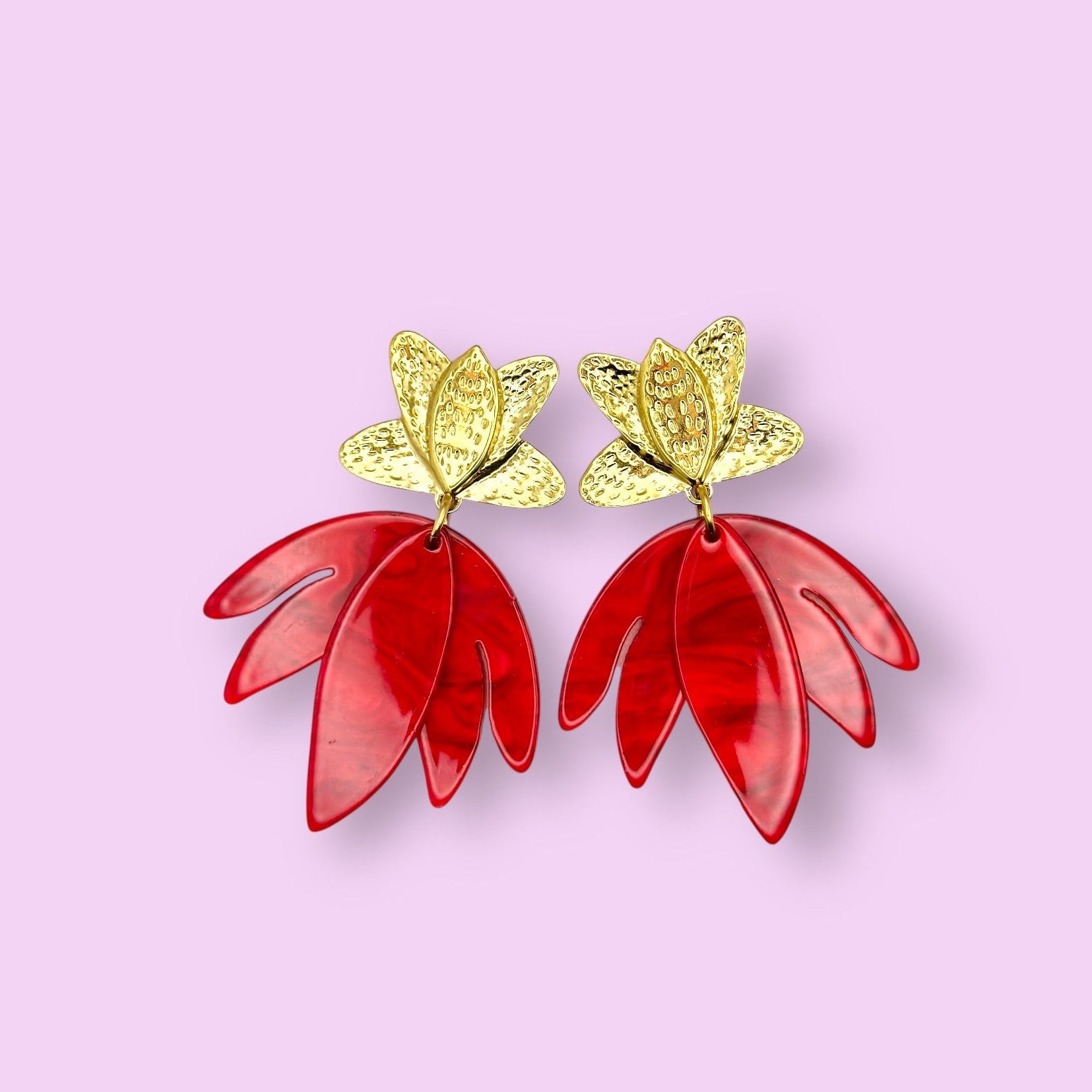 Design: rot marmorierte Acryl-Anhänger in Blütenform mit goldfarbenen Steckern
