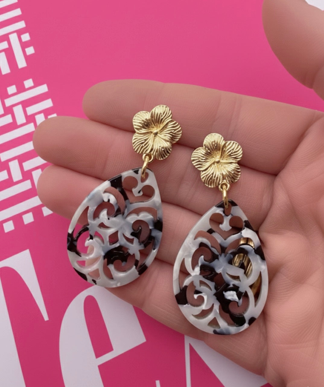 - Design: Ornament Tropfen-Hänger aus Acryl an Goldfarbenen Blüten-Steckern